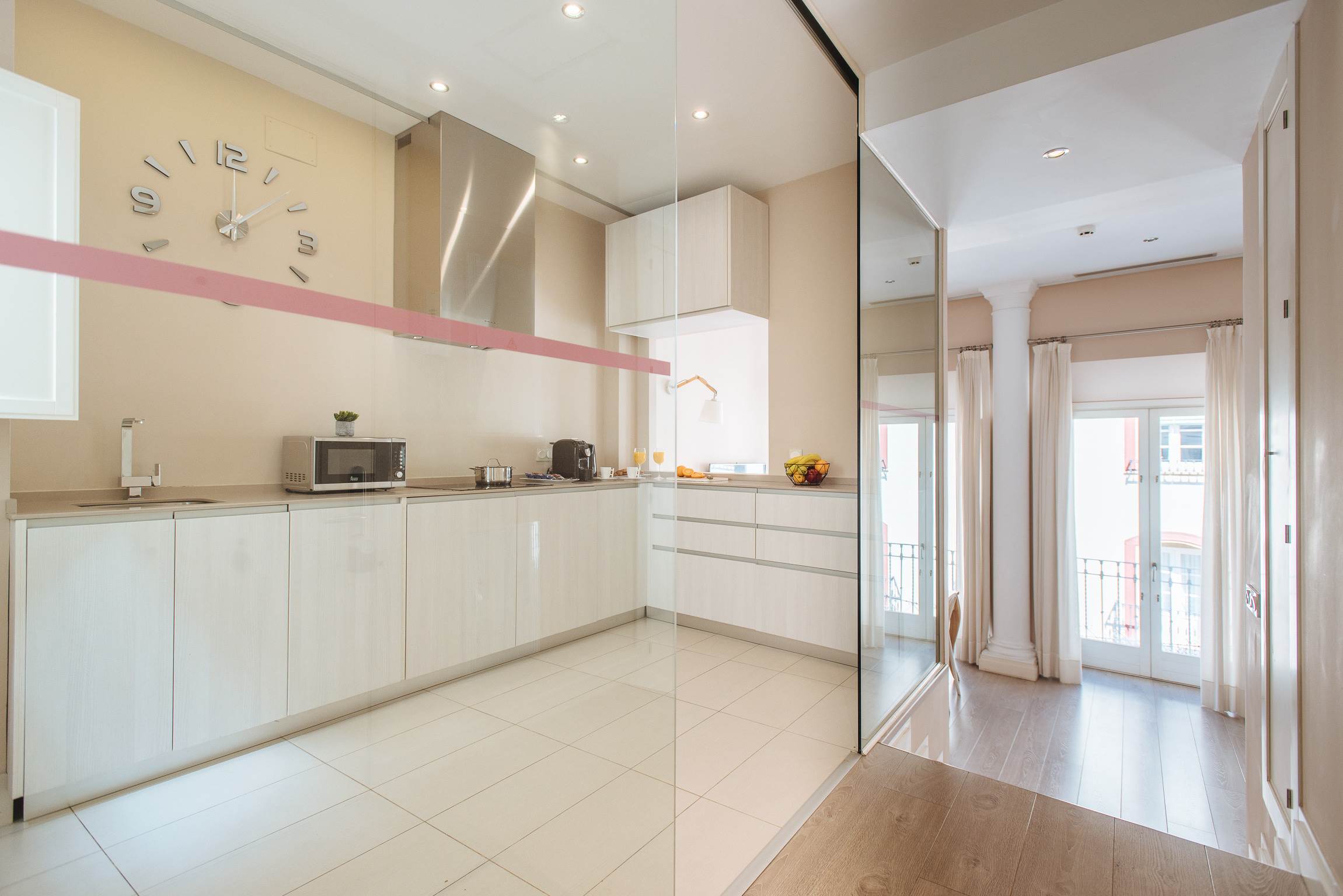 En la segunda planta, apartamento distribuido en: Salón-comedor muy amplio, con 3 balcones con vistas a La Maestranza; Cocina independiente totalmente equipada; Habitación principal con cama doble de 1,50 m. de ancho por 1,90 m. de largo; Baño en suite completo con plato de ducha; Segunda habitación con dos camas individuales de 0,90 m. de ancho por 1,90 m. de largo; Baño en suite completo con plato de ducha.